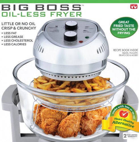 The Big Boss Oil-Less Fryer is ideal for anyone wanting to create tasty, wholesome food without spending hours in the kitchen. Whether you're making a quick lunch or cooking dinner for the whole family, this tabletop cooker gets the job done without the extra fat and calories that a traditional deep fryer can add to your meal. With its efficient two-tray design, the fryer can cook multiple foods simultaneously and even cook meals straight from the freezer without thawing or preheating. And the fryer is easy to use--simply set the time and temperature and keep an eye on your meal's progress through the glass dome top.